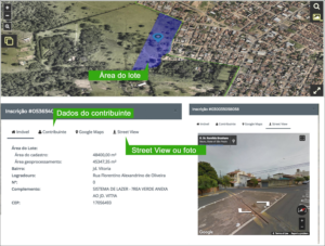 Permite-se ainda visualizar fachada do imóvel (foto própria ou Street View), e a marcação da área na base cartográfica.