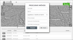 Após a busca, os dados tabulares e espaciais atribuídos ao imóvel, ou proprietário são demonstrados (Área, Endereço, Dados de tributação, histórico de notificações, pendências, etc)